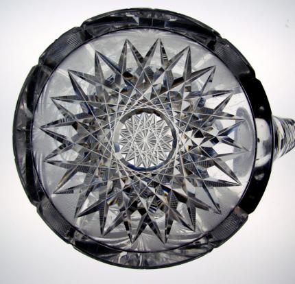 The No. 50 pattern consists of large hobstars surrounded by fan’s, crosshatching, and long parallel bands of sharp crosshatching. The base of the pitcher has a perfectly cut 20 point hobstar and the handle is triple notched.