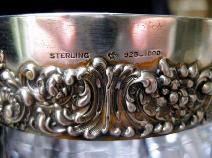 This is a beautiful pitcher in Dorflinger’s Number 50 pattern. It’s a wonderful old piece with a wonderful wood polish and silver collar/spout (hallmarks pictured).