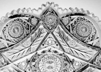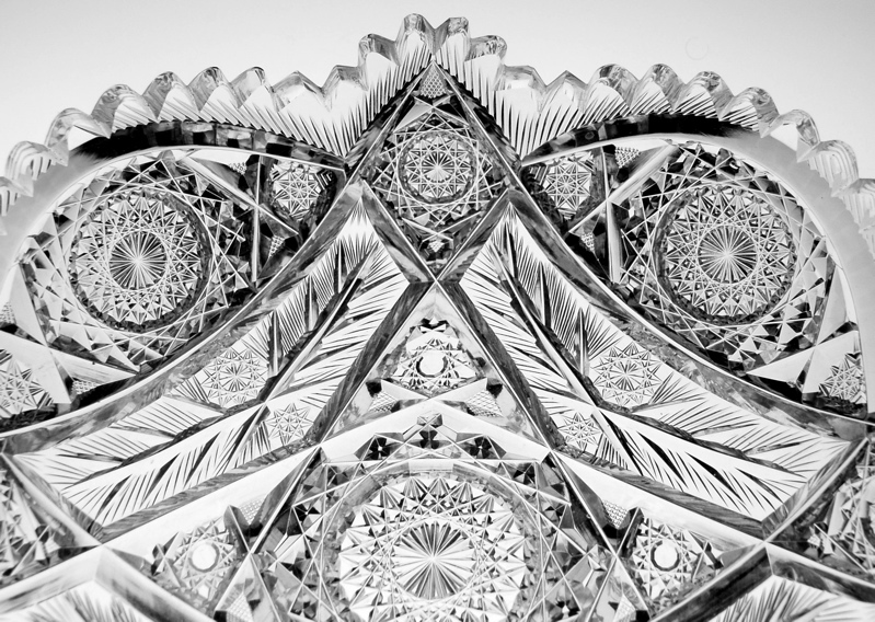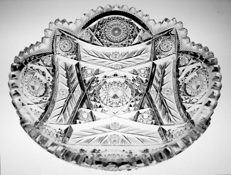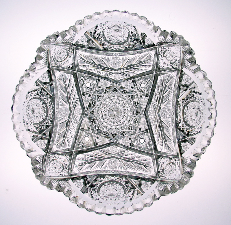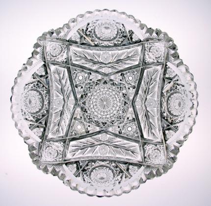 The Diana pattern has a central hobstar surrounded by 4-jeweled center hobstars. This bowl is so well engineered that it actually rests on the jeweled centers of these 4 stars so as to avoid any damage by placing it on hard surface. There is a very unusual feathering motif featuring two hobstars on either side of the “feather.” There are beautifully cut ovoid hobstars and even the edge has a feathered motif!