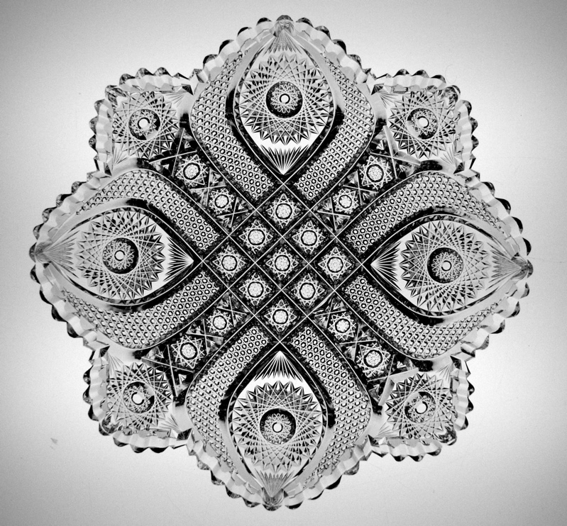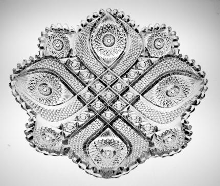 This pattern has a central cross of tiny, but perfectly cut hobstars. AS the cross extends to the edge of the bowl, they meet a larger, clear button hobstar surrounded by fans. On the other lobes of the bowl there are even larger clear-button hobstars. Looped around of these hobstars are bands of tiny, detailed hobnail.