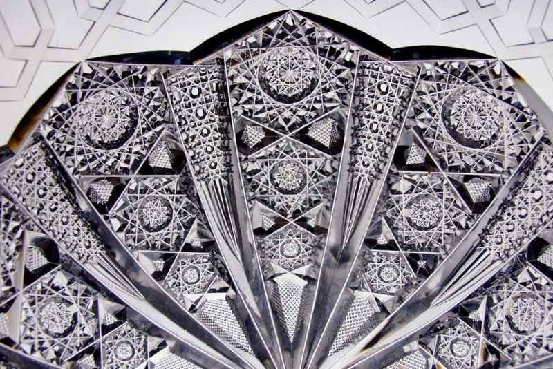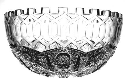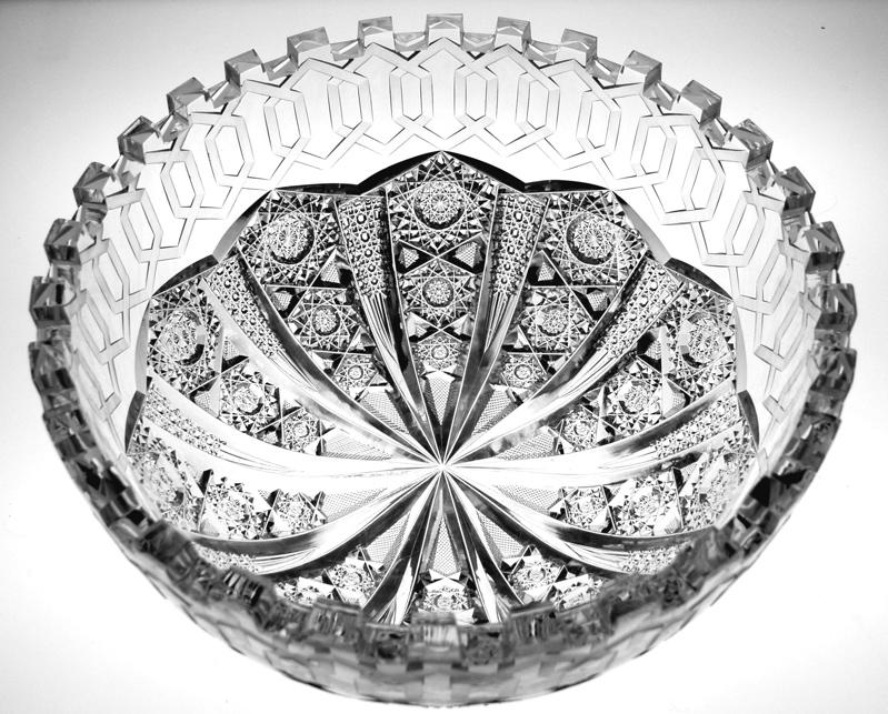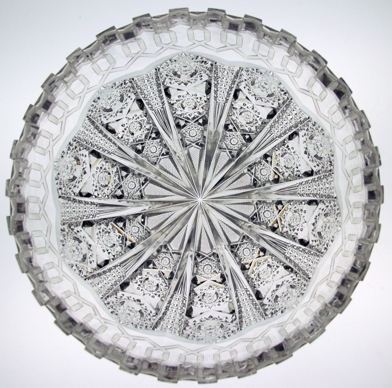 The first thing one notices when examining a piece of Alhambra is the unusual dental rim. Often damaged or poorly repaired, this one is in tip-top shape and I’m almost sure is original. Below the castle-like top is a chain of cut and unpolished Greek key. The rest of the Alhambra pattern is composed of chains of hobstars and bands of cane. The cutting on this bowl is considerably precise, tight, and sharp and the glass is beautifully clear.