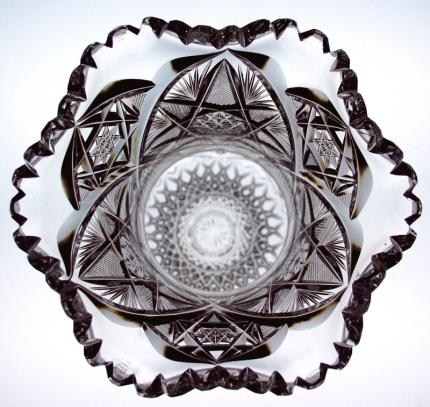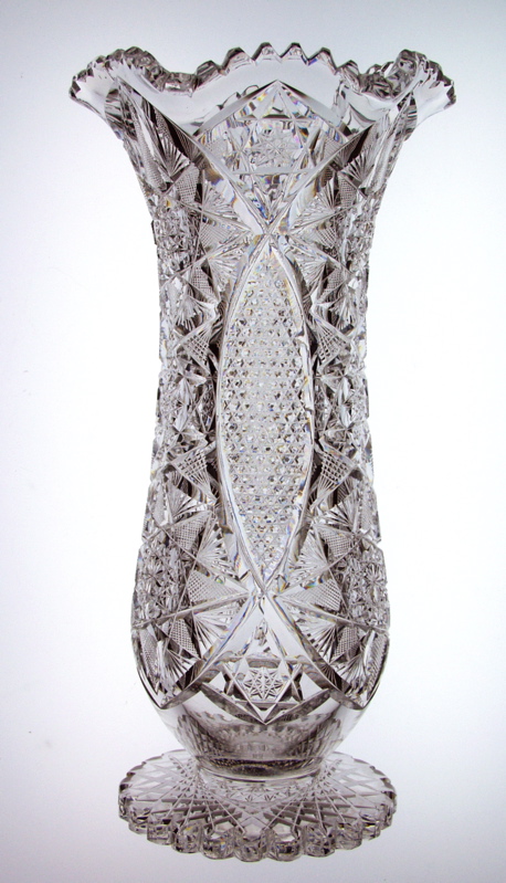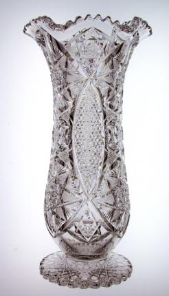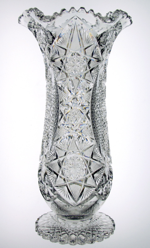 The vase is covered with vertical chains of rajah hobstars. The next panel of cutting features a large vesica of hobnail attached to two 6-point hobstars. The top of the vase is ruffled and the base features a scalloped 12-point hobstar.