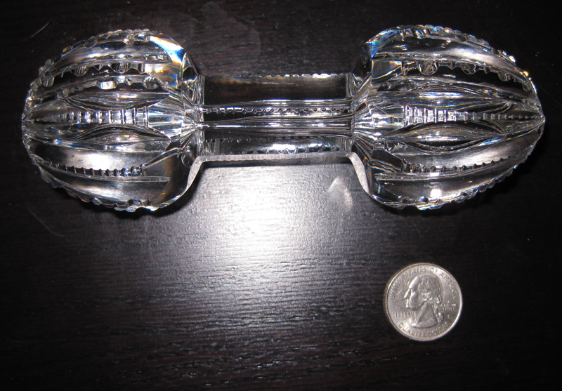 This piece is quite large and I’ve photographed it next to a quarter for size comparison purposes. It measures 5 7/8″ long and 2″ high. The glass is exceptionally clear and heavy – a true beauty to add to your collection. I have three of these with the other two in rougher condition.