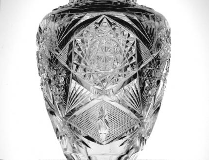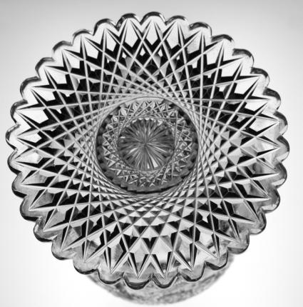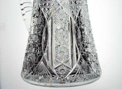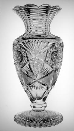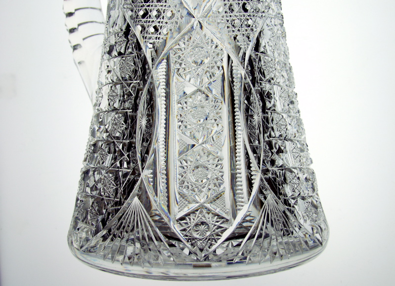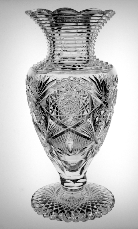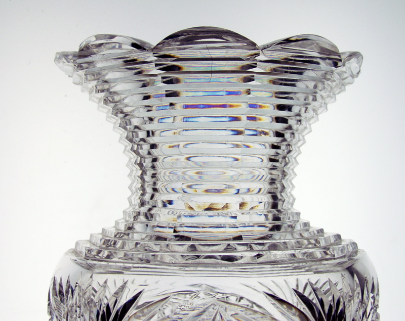 The vase is really a perfect balance between motifs. The richly cut stair neck and rim radiate light in every direction. The Rookwood pattern’s defining motif is the diamond field with a clear, deep split. Topping that field is a large hobstar which is seperated from the rest of the pattern by a cane field and crosshatching. The base of this piece is particularly impressive with a large 32-point hobstar and a serrated edge.