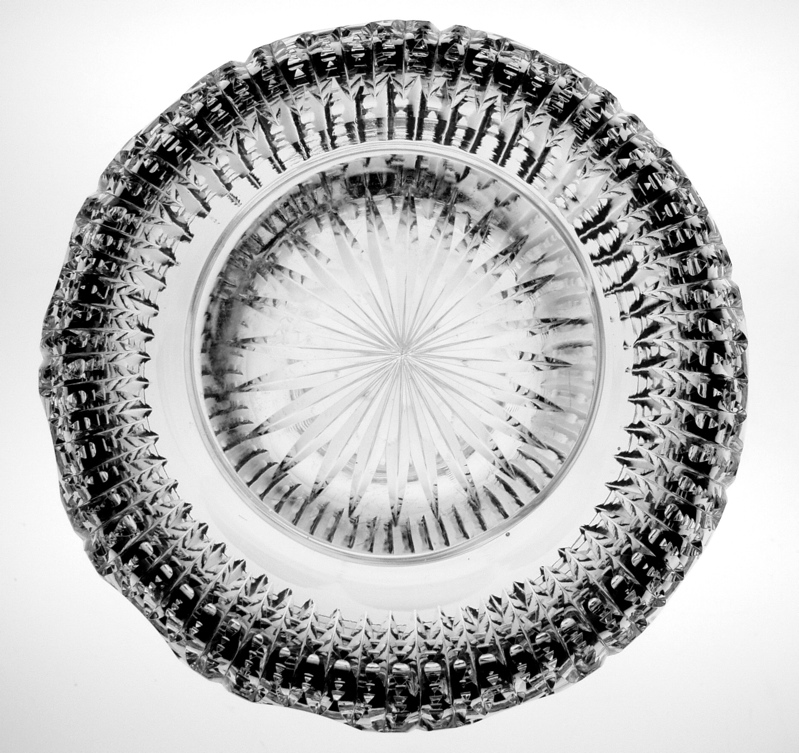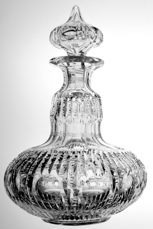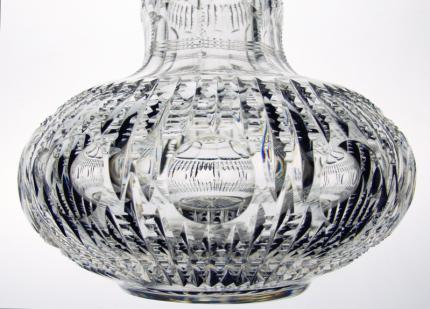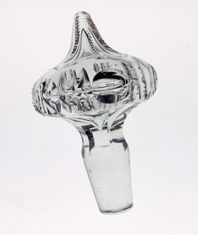 This decanter, cut in Bergen’s Florida pattern, is simply one of the most unusual forms in Brilliant Cut Glass. It is genie bottle in shape with a cut-in-pattern stopper of the exact same shape – truly a touch of class. This exact piece is pictured clearly in the ACGA’s Bergen catalog reprint.