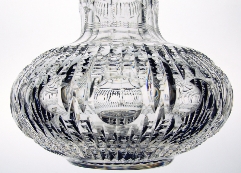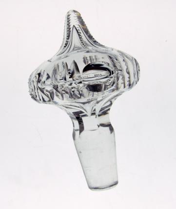 While this pattern is understated, it works perfectly with the unusual shape of the decanter. Notched prism is spread throughout and alternates with flutes and notched cutting. Around the perimeter of the decanter, there are clear cut punties which work as an optical lens when looking through the decanter. The base features a rayed star. The stopper features the exact same punty, notched prism and flutes and notching at the top. It is hollow with an air bubble contained within.
