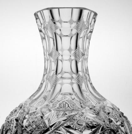 Aside from the incredible cutting on this piece, the design is equally impressive. It is perpetual in that it wraps seamlessly around the perimeter of the carafe. The first section of the pattern involves an unusual six sided hobstar formation. It’s surrounded by crosshatching and topped vertically with cane cutting. A large loop of clear button hobstars engulfs the formation and weaves over a band of cane. This band of cane engulfs a large, ovoid hobstar. Divided only by clear-button hobstars. Sitting between the two bands is a fanned formation featuring one flat hobstar, crosshatching and fans. The base houses a fanned star and the entire neck of the carafe is finished with large scallops (not quite punties) and crosshatching.