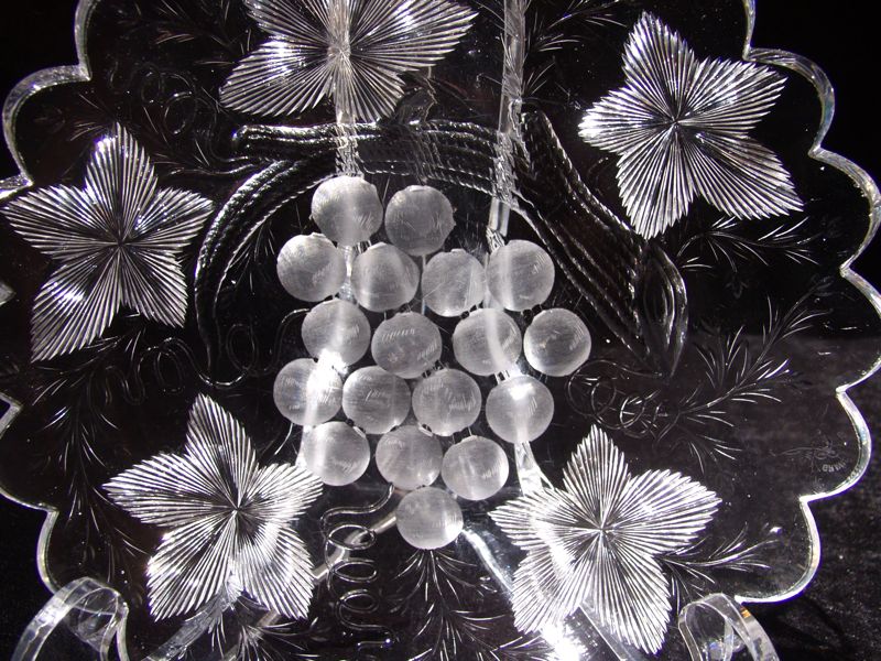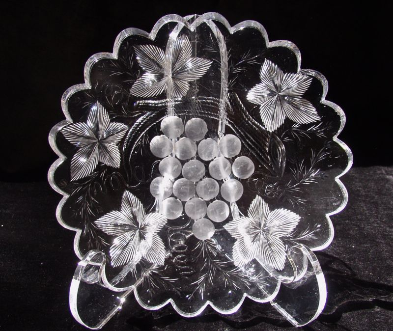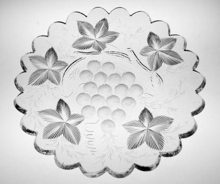 The realistic engraving is incredibly detailed on this plate. A branch drapes across the upper portion of the plate. Dangling from the branch is a bunch of grapes surrounded by tendril vines. Five incredibly cut and vibrant leaves surround the outer portion of the plate in between some more realistic engraving. The plate has an unusual scalloped edge which only contributes to its attractiveness. This piece is on an extremely thick blank and gives the appearance of heavily carved rock crystal.