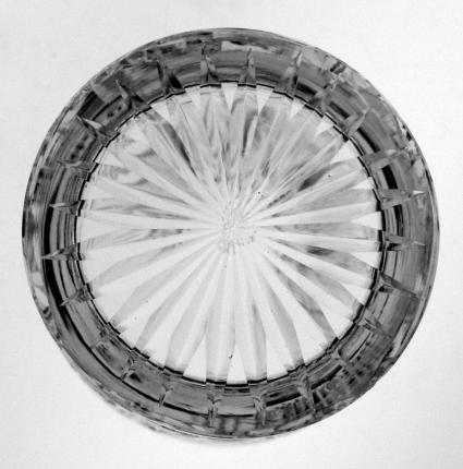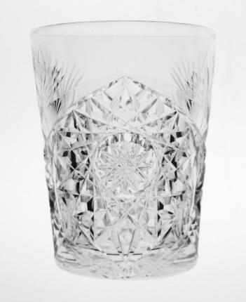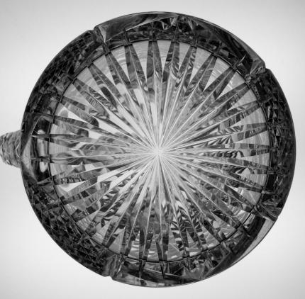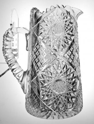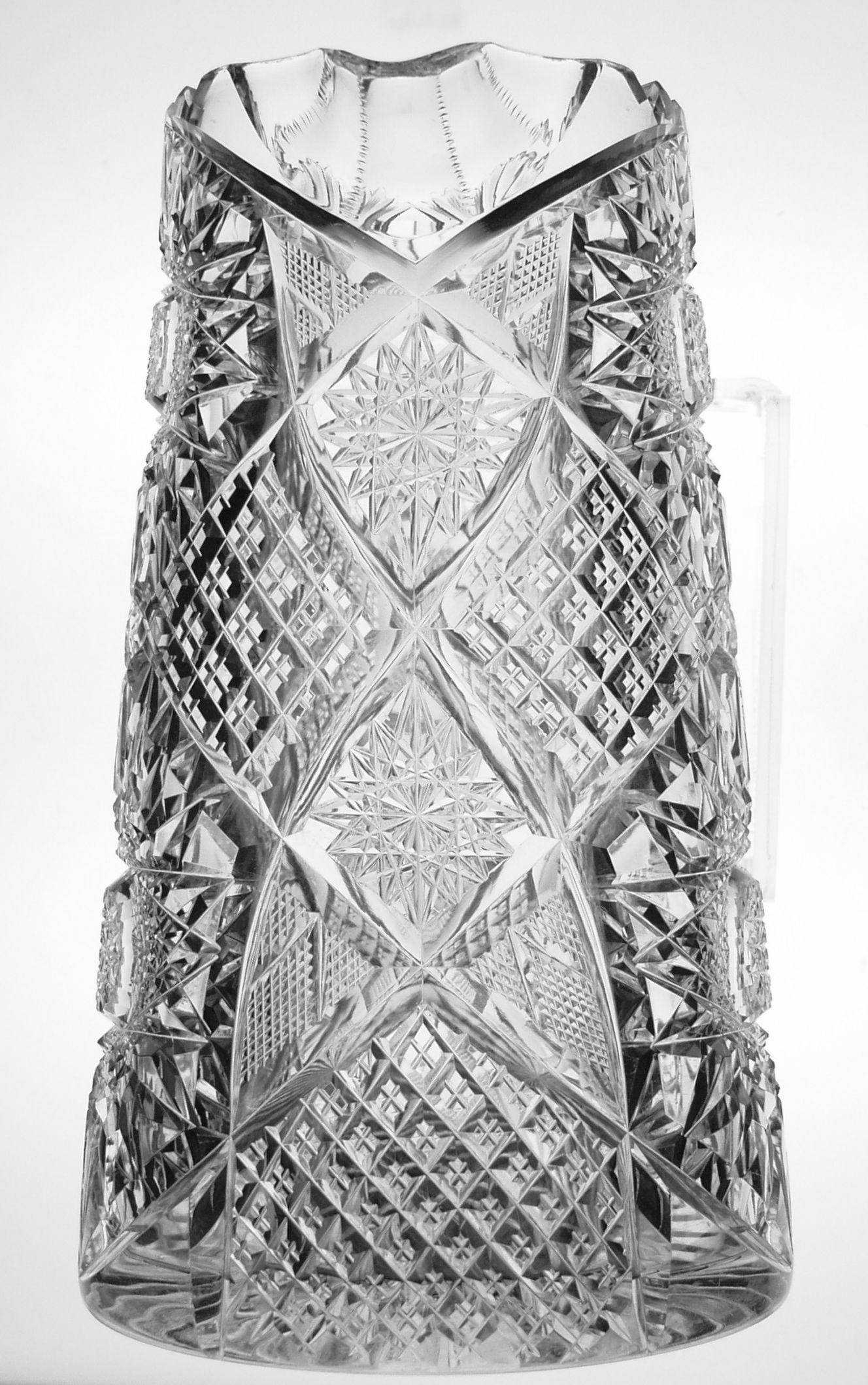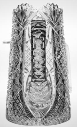 Two large hobstars adorn the side of the pitcher. Strawberry-diamond cutting falls between each of these large hobstars and run into an unusual split crosshatched motif. This split crosshatching intersects with two flat hobstars. The rim of the pitcher is cut with the elaborate fans that the Sultana pattern is so well known for. The handle of the pitcher is triple notched and the base is finished with a rayed star. The tumblers also include a rayed star on the base.
