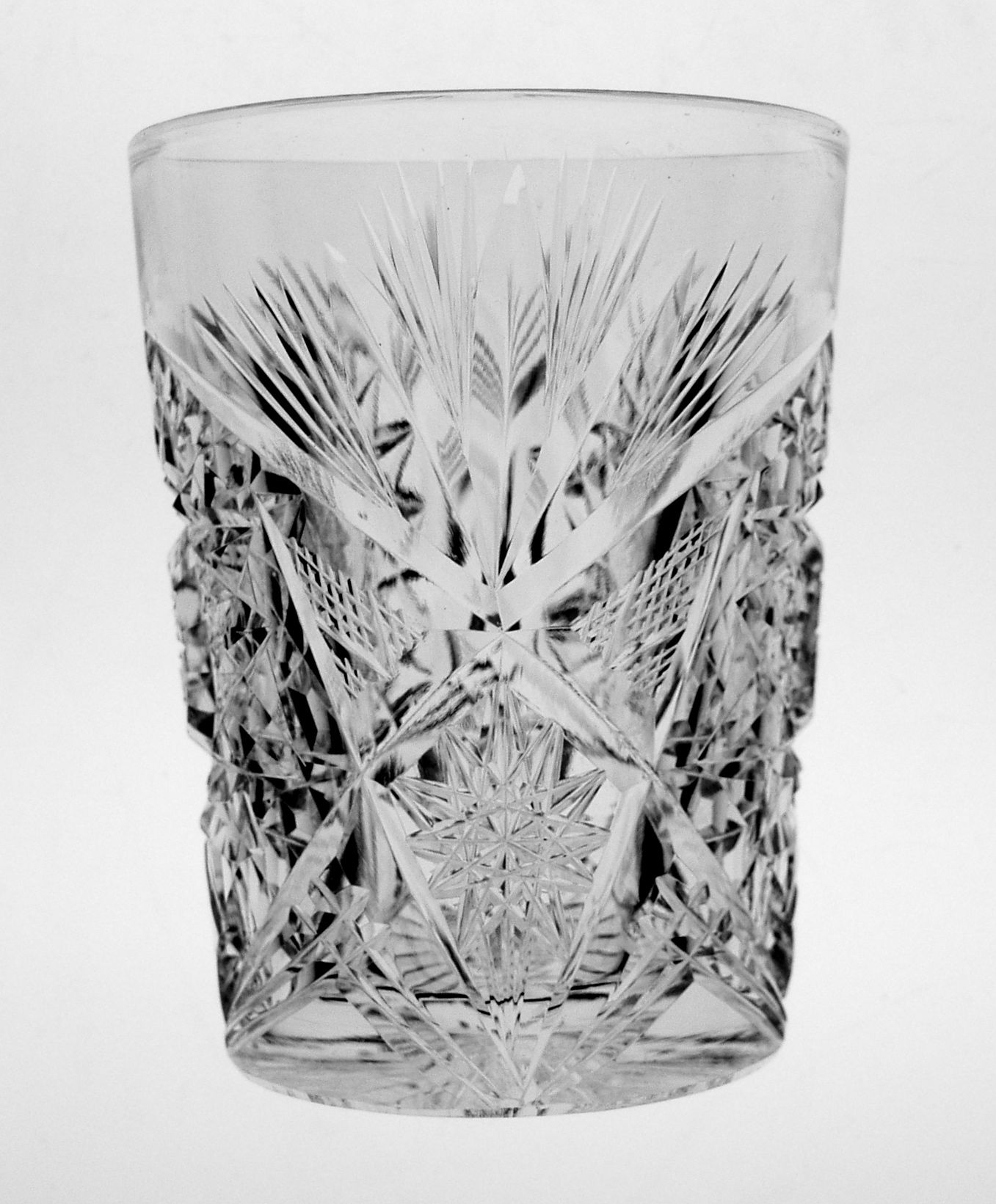 This pitcher and tumblers are both cut in Libbey’s Sultana pattern. All five pieces are signed with the Libbey sabre mark. Libbey made the Sultana pattern considerably more elaborate on this pitcher adding several additional motifs.