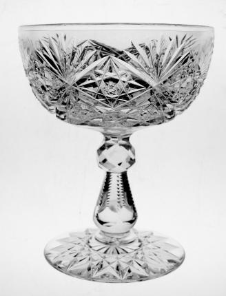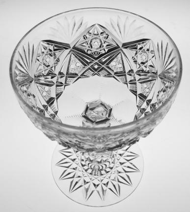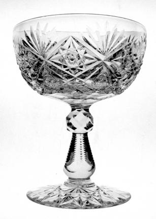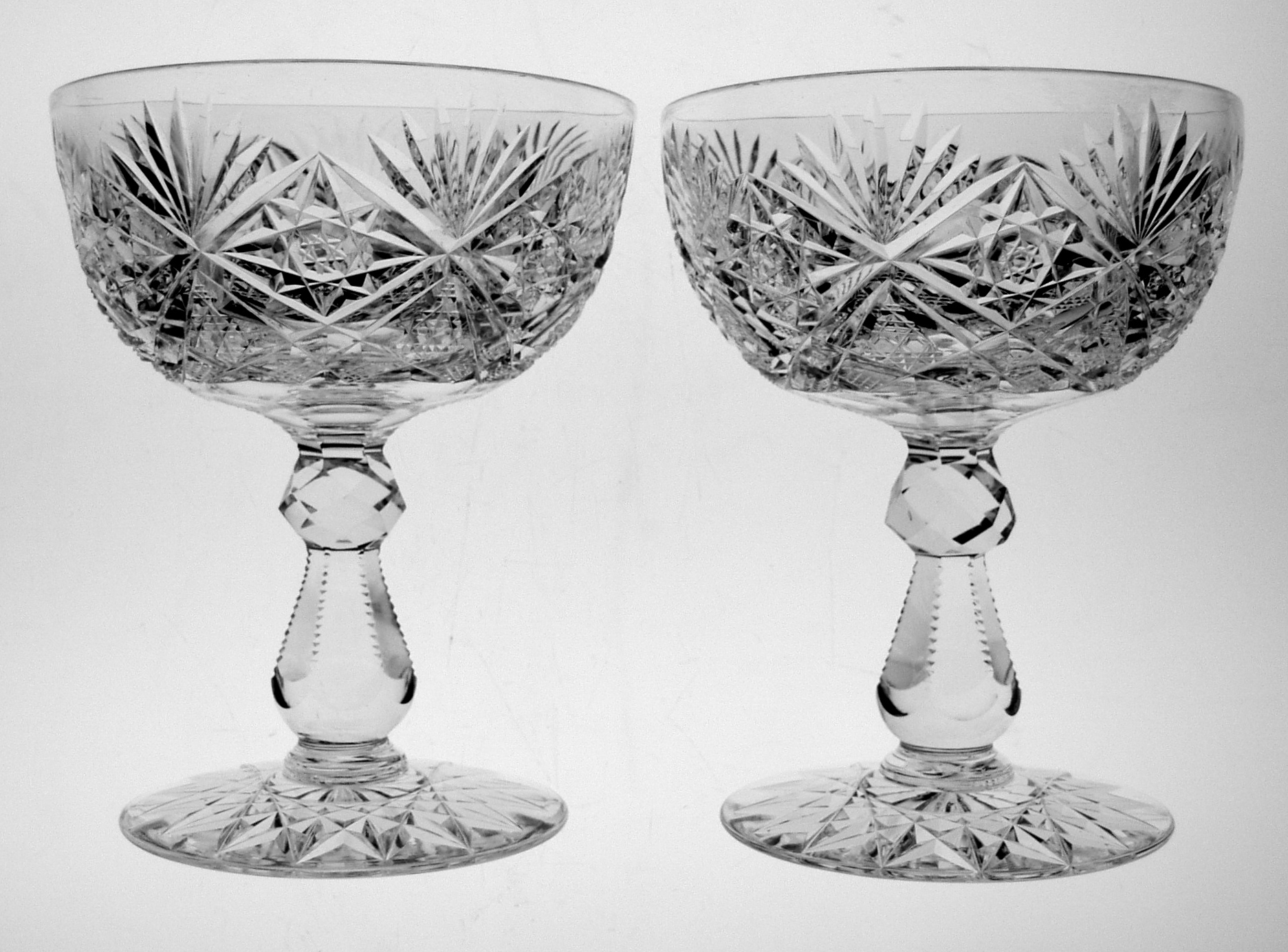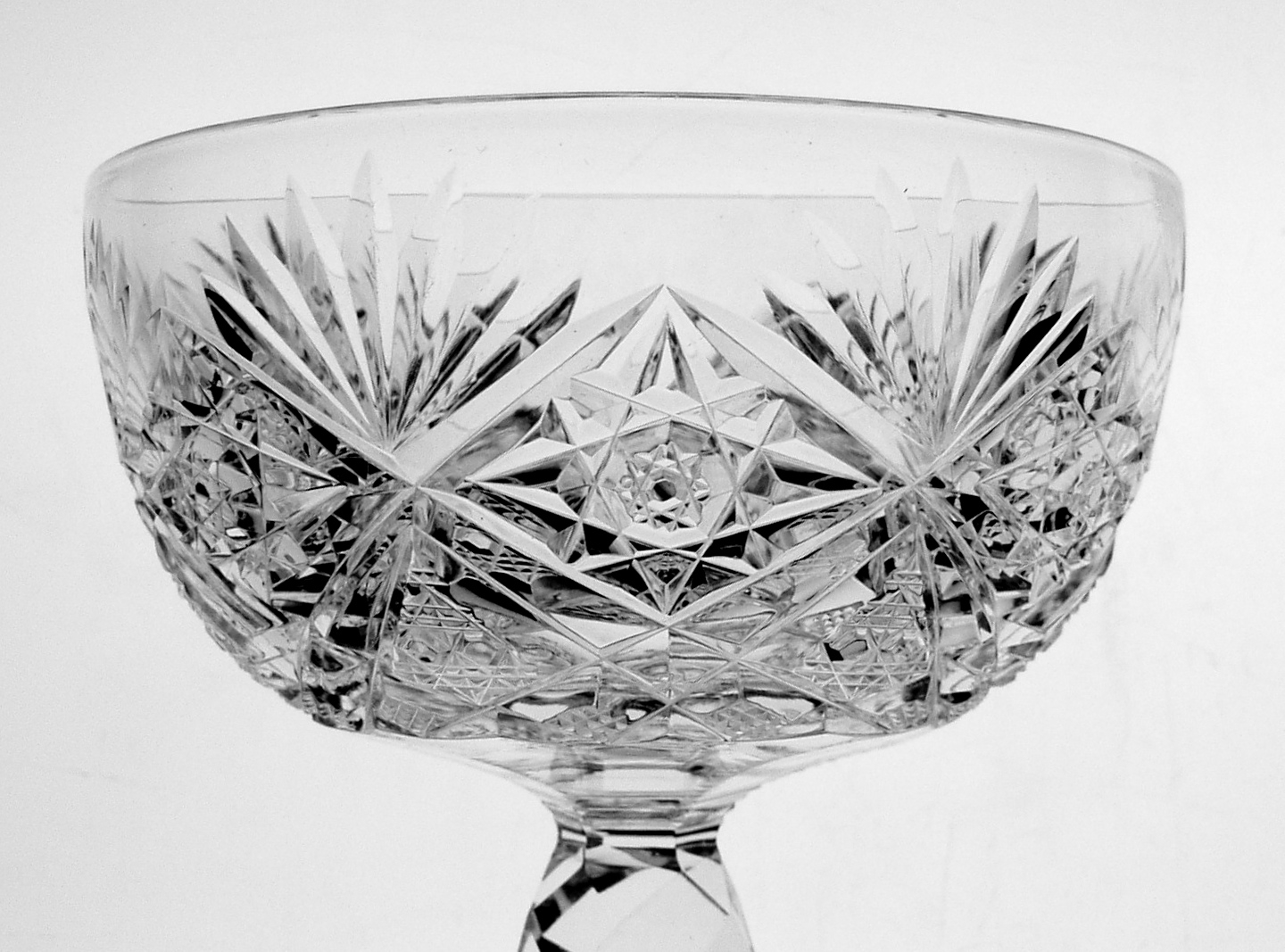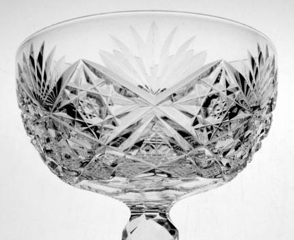 The pattern is quite nice combiningĀ elementsĀ of Kensington and Portland. Eight-pointed, clear button hobstars with clear-button centers adorn the perimeter of each steam. each is separated by a modified kohinoor-type cutting which is situated atop some crosshatched fields. The edge of the pattern is finished with fans. The bases of the champagnes are each finished with 16-spoke split point hobstar.