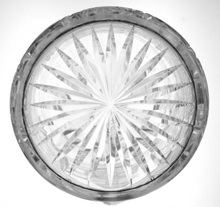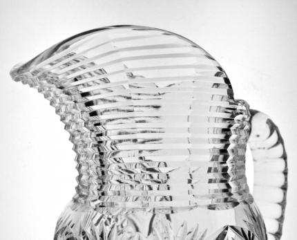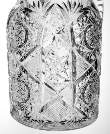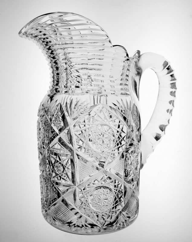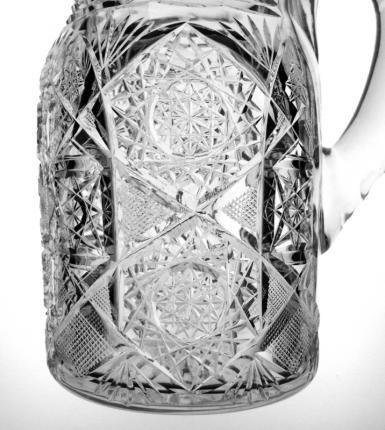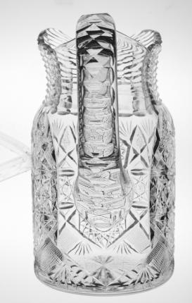 The pithcer has a stack of deeply cut hobstars separated by fields of crosshatching. These stacks are divided by a flat, 8-point star toped with clear, mitered panels on both sides. A Christmas-style star finishes out the design along with fan cutting. The entire neck and mouth of hte piece is finished with gorgeous stair cutting. The handle is triple notched and the base is finished with a rayed star.