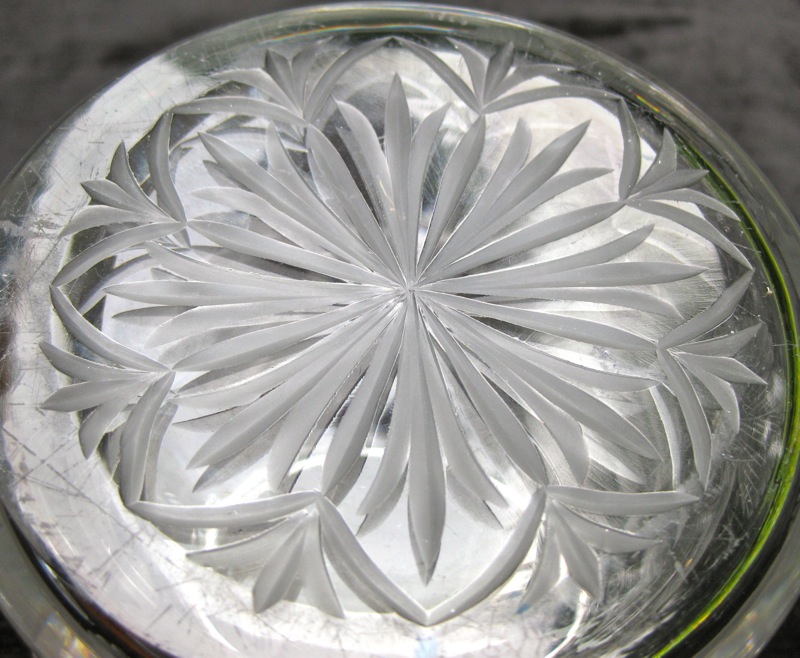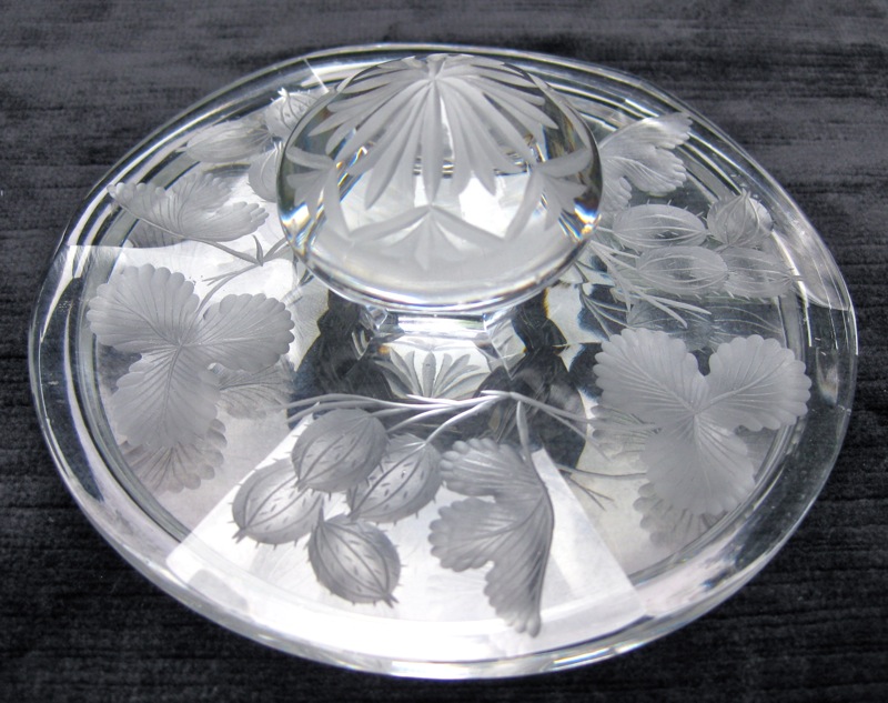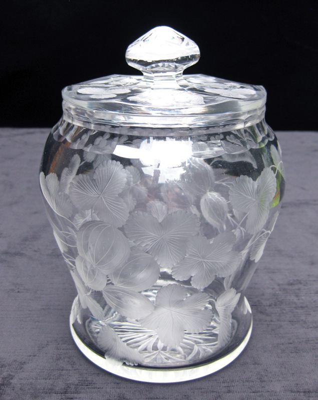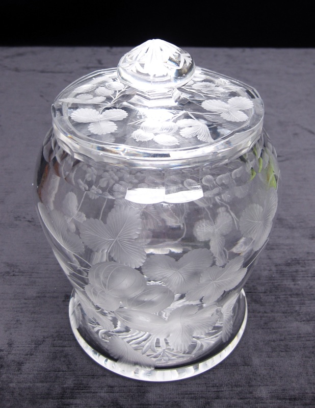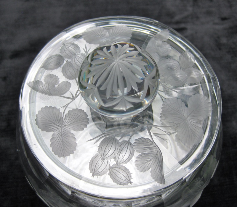 Beautiful gooseberries are engraved down the entire jar. The come in clusters of four and the detail in stunning. The lid, on its own, is a complete work of art. It’s fluted and then engraved entirely in the design. The finial has an unsual rayed star with border and the base has the exact same design.