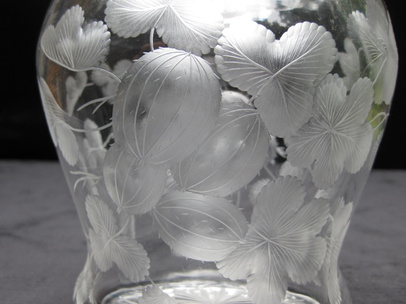 This jar is done in Sinclaire’s Engraved Gooseberries design. Gooseberries engraved during the Brilliant Period are rare and at to that this is a two part jar and you have a certainly unusual piece. The piece is signed with the Sinclaire logo on the base.