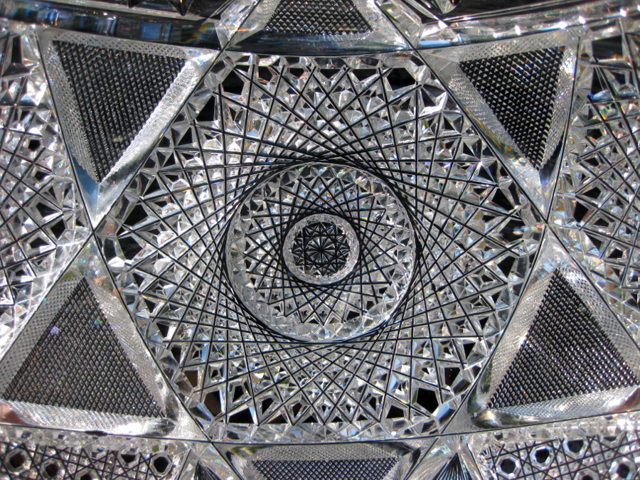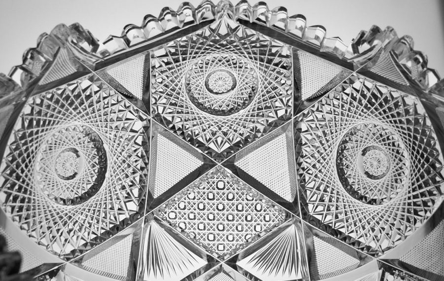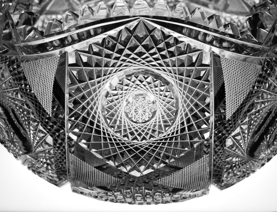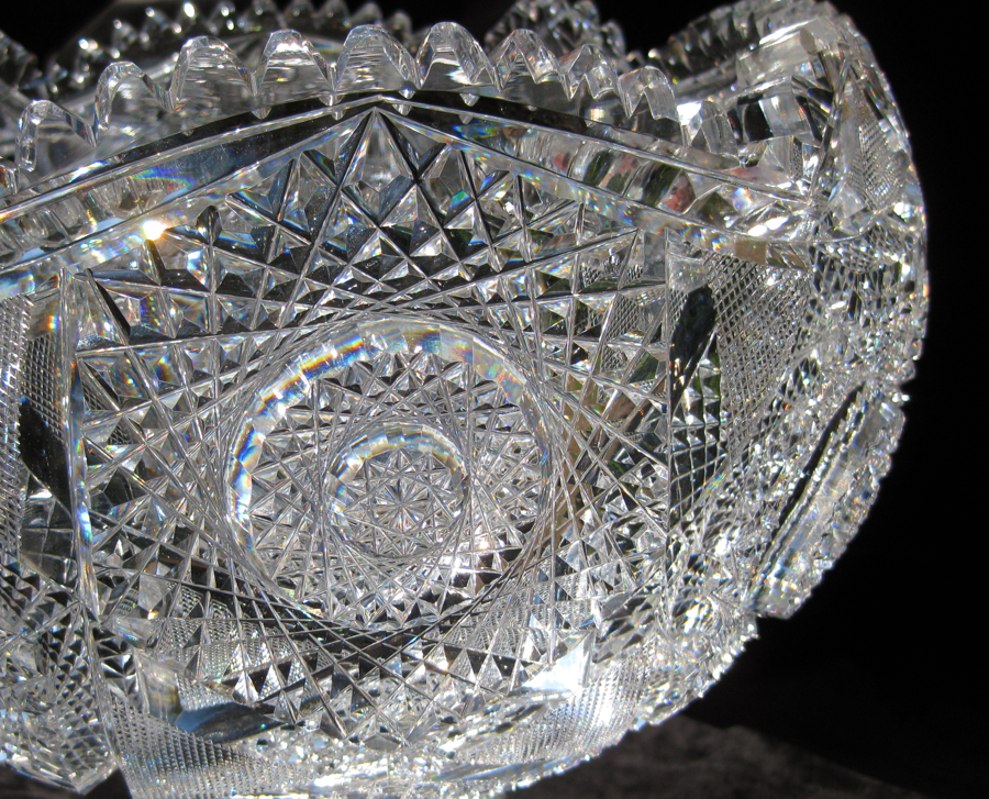 First, let’s talk about the hobstars. Huge, triple-layer hobstars alternate with each other – one having 32-points while the smaller of the two features 30. They’re meticulous and perfectly cut. Each is surrounded by triangular fields of crosshatching – making an almost 6-point star formation with the tremendous interior. Close to the plug of the bowl is cane cutting and fans. The base repeats the pattern perfectly and features the aforementioned swirled tusk collar. This is so much more impressive than the normal lapidary collar featured on 95% of punch bowls from the period.