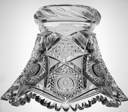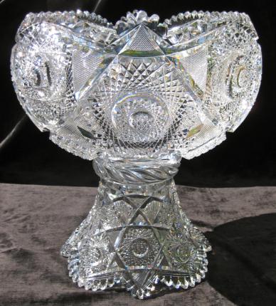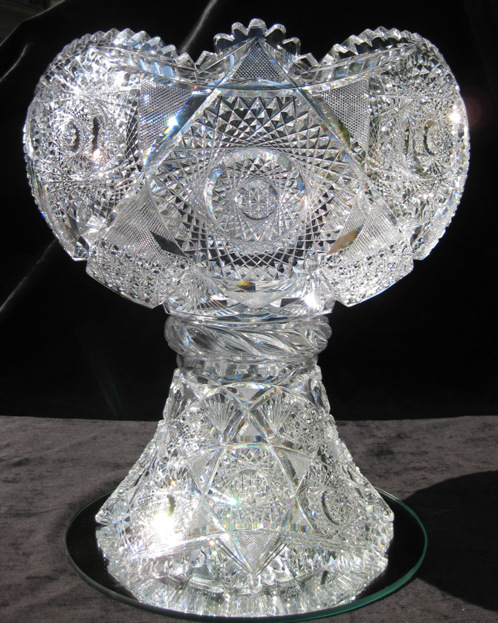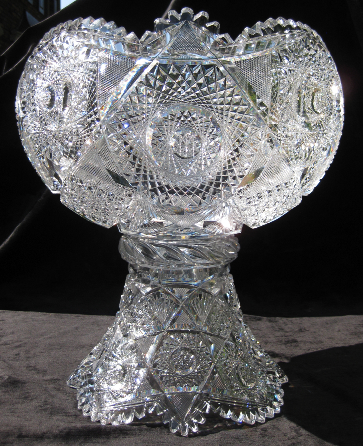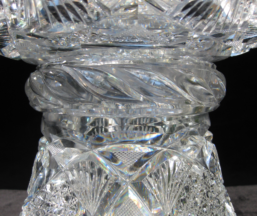 Globe punch bowls are possibly my favorite shape in cut glass. They offer so much more to the shape and definition of a punch bowl than the more traditional top. It seems certain that this piece was made by J. Hoare as it has a swirled tusk collar – a technique they seemed to singularly used. Also, on some of their larger pieces, they embellished patterns to feature wedding-cake hobstars.