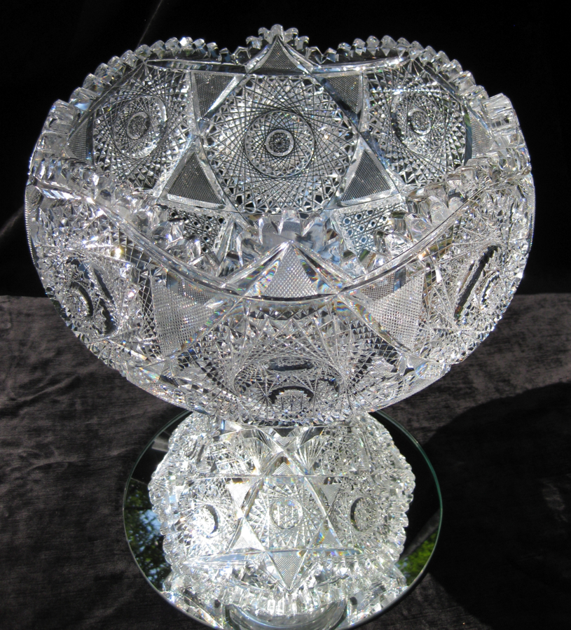 This punch bowl is not only gorgeous but also gigantic – measuring 16″ high and 15″ tall! Altogether, it weighs 27 pounds! The blank is extremely thick (nearly 3/4″ thick) and exceptionally clear. The condition of this monumental pieces is also astonishing – there’s not a mark on the edges – just a few fleabites towards the interior of the bowl’s pattern. They are hardly noticeable and again, the bowl is in near-mint condition inclusive of that exception. Globe punchbowls are rare to begin, but ones this nice are hardly existent. Study the photos carefully – notice the depth of cutting and radiant, prismatic effect of the high quality blank – few punch bowls are this nice. Offered at a price you may see much lesser punch bowls for.