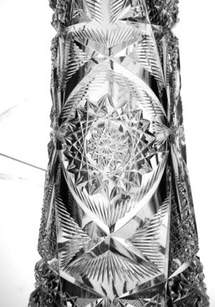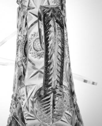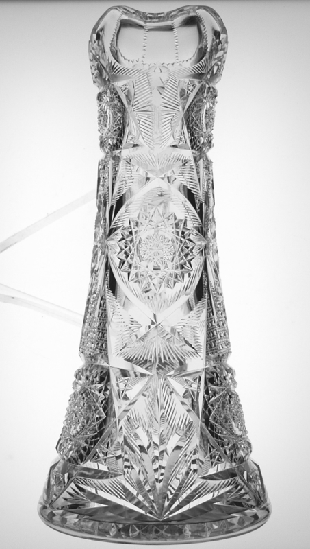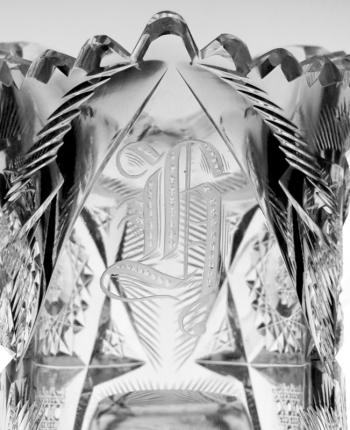 This tankard was cut in Libbey’s rare and highly desirabe Rajah pattern. It is signed on the handle with the Libbey-sabre trademark. Interestingly, I once owned this same blank in Grand Prize and it was monogrammed  above the handle. This piece is also monogrammed with what I believe is the letter “G.” This is just another sign that someone thought this was a very special piece at the time it was ordered.