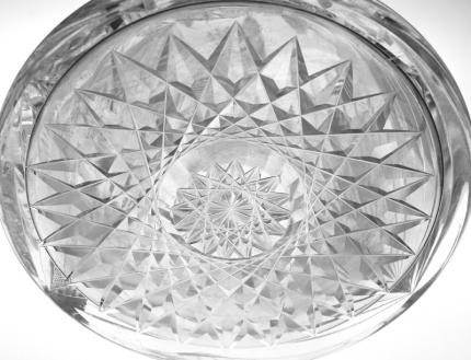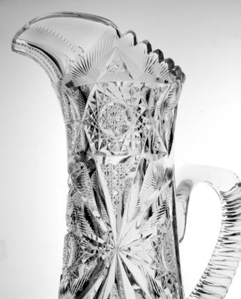 This large piece is cut to the 9’s. There is a unique 6-point star formation at either end of the pitcher. They both meet at extended points filled with cane. The points of the formation are filled with 5-point stars filled with crosshatching. These formations give the appearance of shooting stars and are feathered around on all sides. Crossed feathered cutting extends down the front of the pitcher and frames an 18-point, split-point hobstar. Even the handle features feathering to keep in sync with the rest of the pitcher! It’s stunning attention to detail that makes this pitcher so much more impressive than most pieces. The base of the pitcher features a large 24-point hobstar.