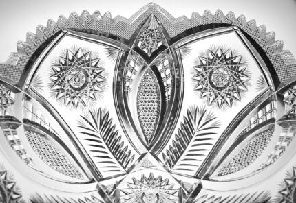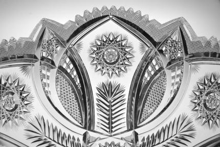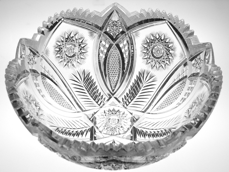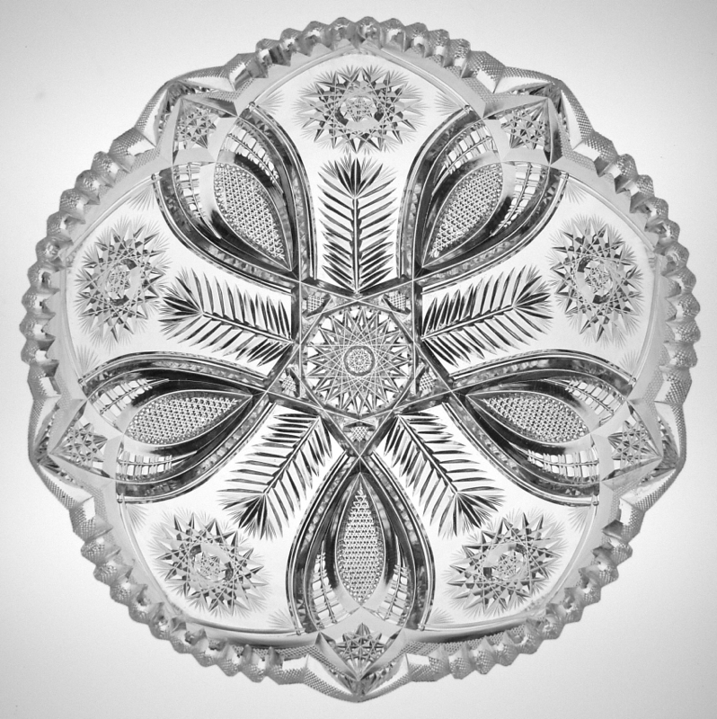 Vesicas of hobnail framed by notching spur off the central hobstar of the design. These vesicas come to a sharp point at a flat hobstar. In between each vesica is a branch of notching with fans that leads to a deeply cut, flashed hobstar. The border of the bowl really makes the pattern pop – silvery crosshatching frames everything so well, especially at the points of flat hobstars.