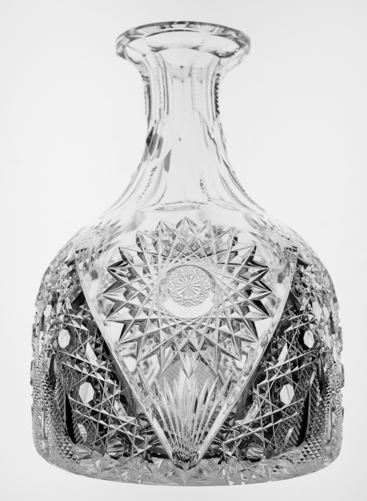 The pattern features three large vesicas. The center portion is made up of a split vesica of crosshatching. It’s framed by cane cutting that converges on a clear center, 8-point hobstar. The star is surrounded on either side by fan cutting. Lying between each large vesica is a deeply cut 20-point hobstar. The neck is fluted and features St. Louis diamond while the base is finished in a 24 split-point hobstar.