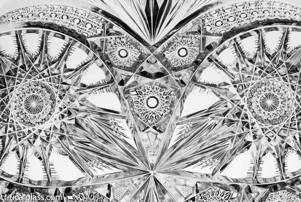 The bowl is split into three sections surrounding unusual hobstar formations. There are deep scallops cut between the points of each hobstar which are divided by notched cutting. Below each hobstar is checking – another Anderson motif. The other portions of the design feature a cluster of three clear-button hobstars with bands of cane spurring off of each.