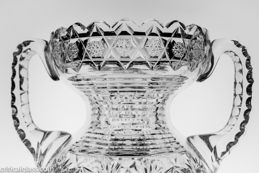 The body of the vase is cut heavily with a variety of motifs. There are large deep hobstars with a vesica of cane coming up between them topped with a flat star. Below each deep hobstar is crosshatching and notching with fans. The neck of the vase is stair-cut which leads up to a band of hobstars at the rim. The handles are triple notched while the base is cut in pattern – extremely unusual for vases.