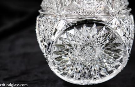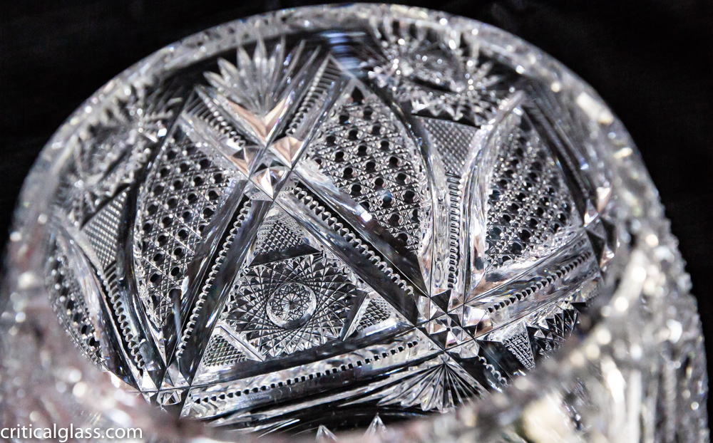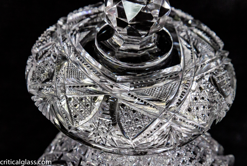Triangular fields of cane mirror each other on either side of notching. In between each field of cane is a hobstar perched atop tight crosshatching. Under the notching is a super-tight field housing a hobstar and framed on 3 sides by crosshatching. The lid is completely cut in pattern – an amazing feat given how little real estate the cutter had to work with. The base features a split point, 26-point hobstar.