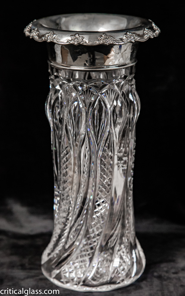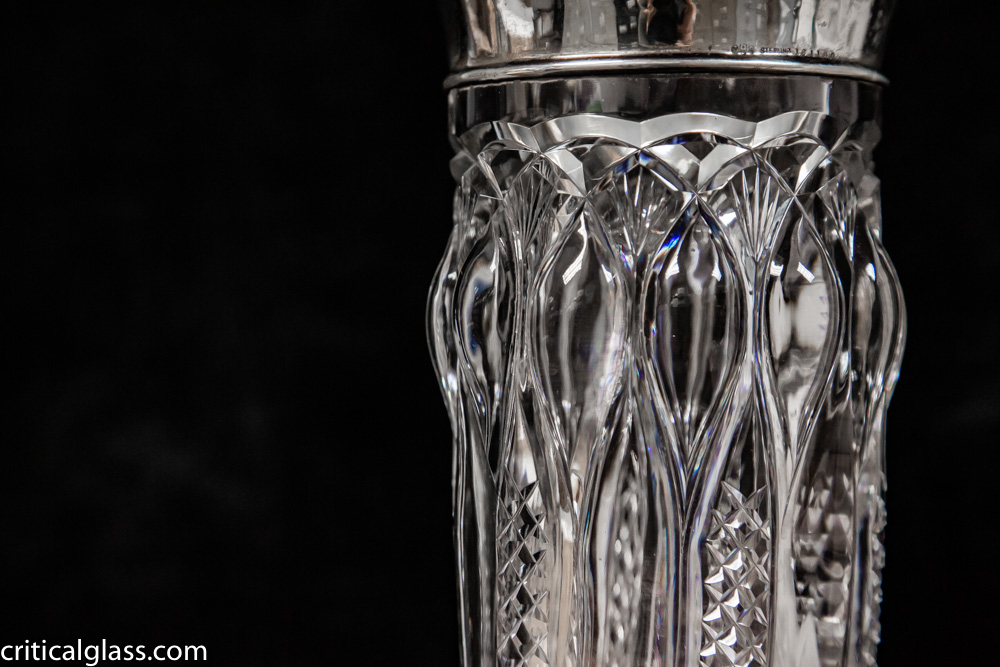 This vase was likely cut by J. Hoare – it uses a variety of motifs they were known for and the hobstar base, in addition to these screams J. Hoare to me. The top is mounted with beautiful Gorham sterling.