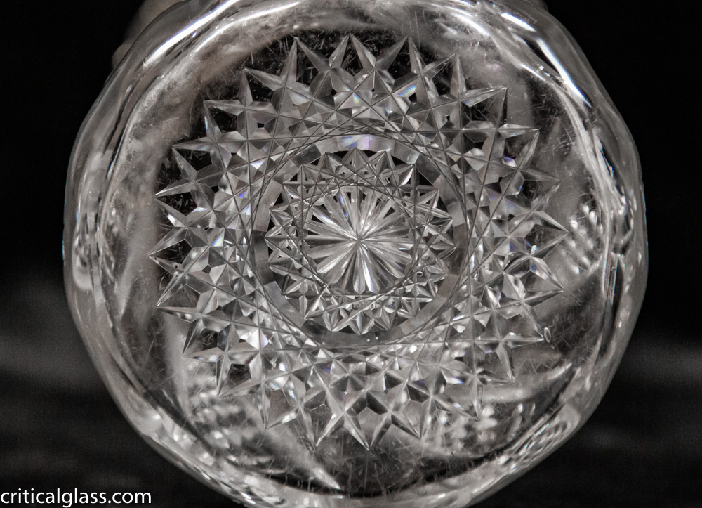 Thick, deep tusks swirl around this piece and are interspersed with tight, diamond cutting. They frame large, clear tusk bulges which are cut in the glass, not blown (unusual for this style). The base of the vase. undulates with the design and is covered in a 24″ point hobstar.