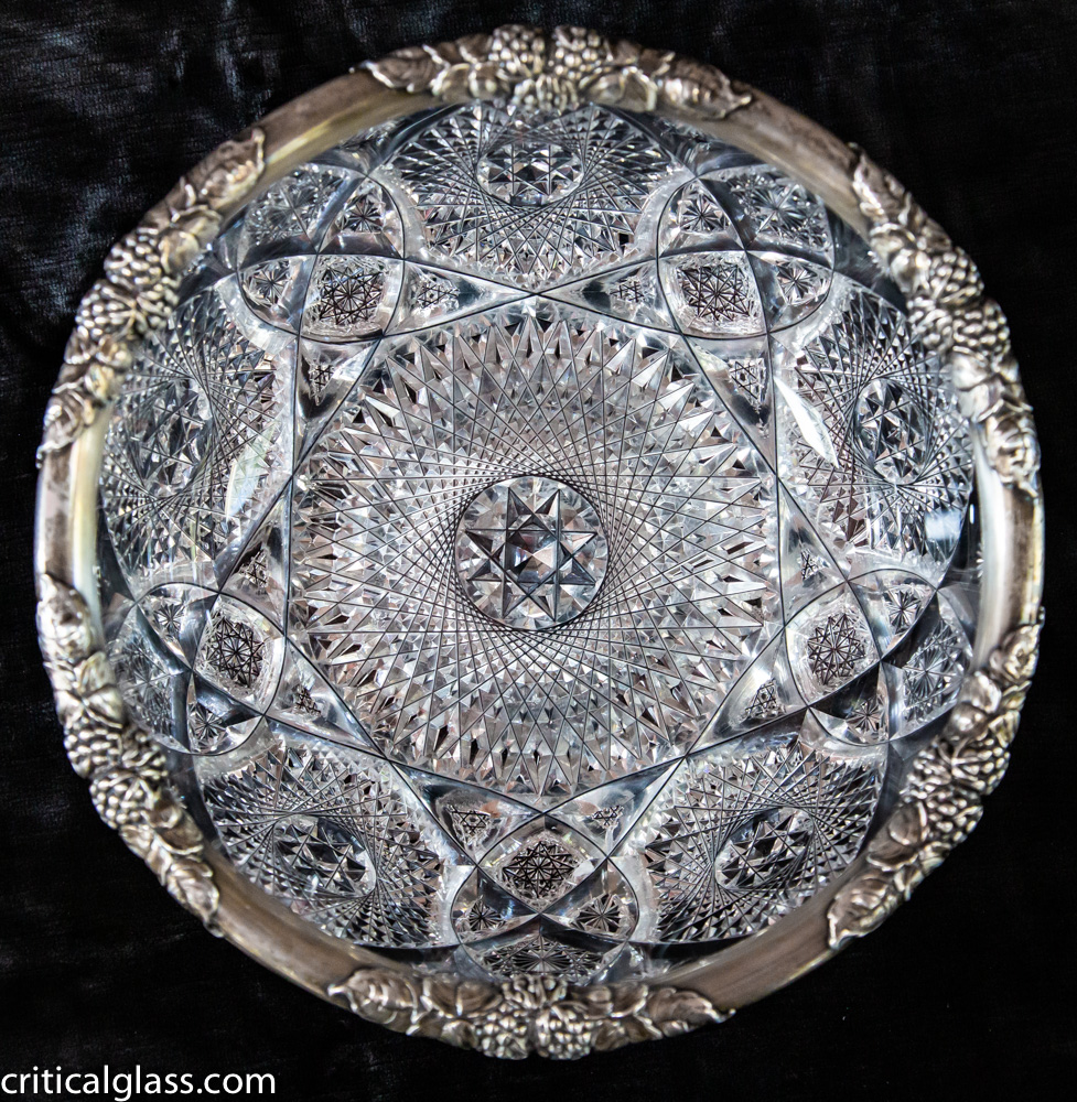 The center of the bowl features a huge, 40 point hobstar with a rose-diamond center. These are repeated around the edge of the piece and separated by vesicas of stacks hobstars and fan cuts within the vesica. The silver on the bowl is gorgeous vintage with highly detailed grapes and vines.