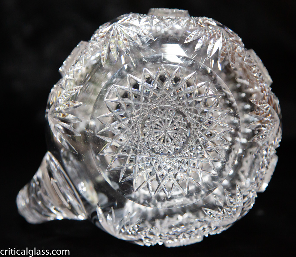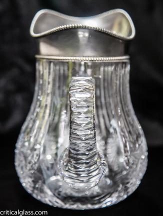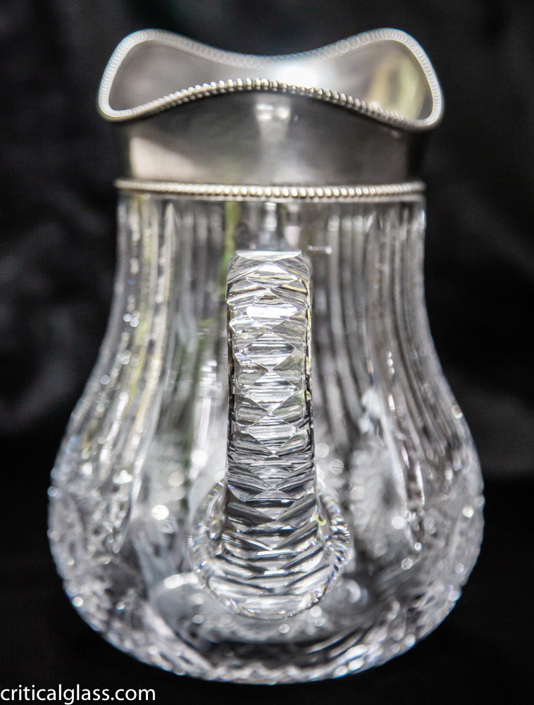 Deep notched prism runs down from the sterling mount and meets deeply cut hobstars which surround the perimeter of the pitcher at its widest point. The handle is triple notched and the base is covered with a 24-point hobstar.