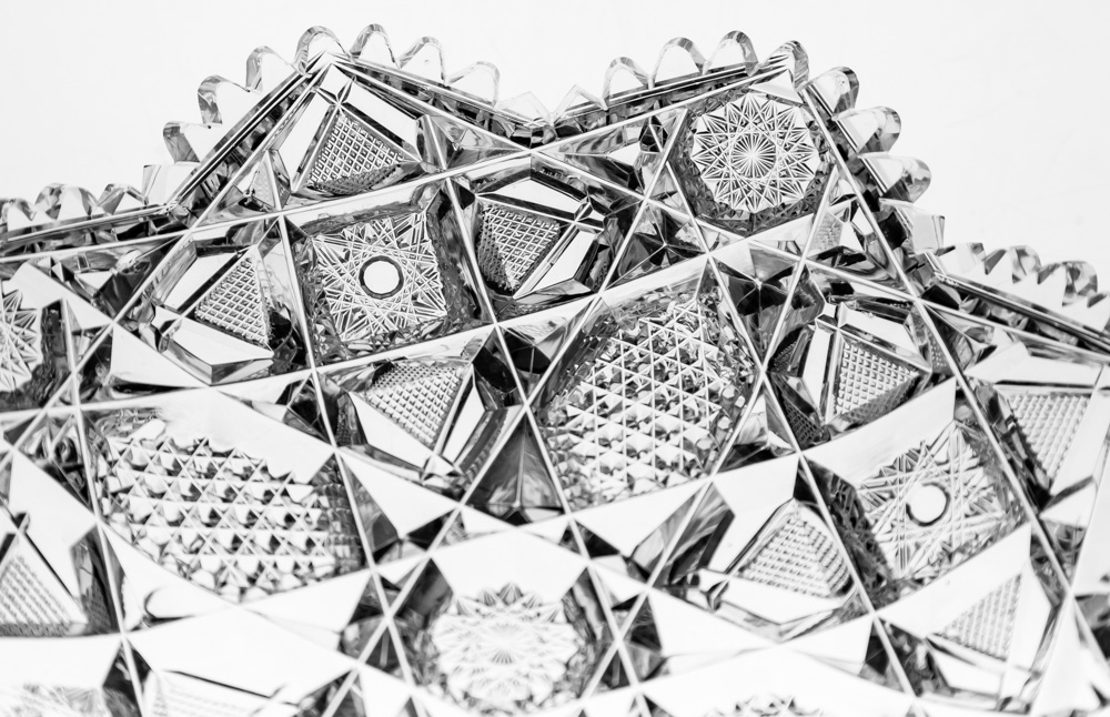 A cross of hobnail meets in the cente rof the plate at a flat hobstar. Extremely deep miters frame this work and lead into another unusual cross featuring a clear-button hobstar. This hobstar actually has two layers of miters, which creates almost one hobstar layed atop the other, to the side – Isabella is the only design I know of that has that. The hobstar has four sides with crosshatching and clear areas creating a triangle.