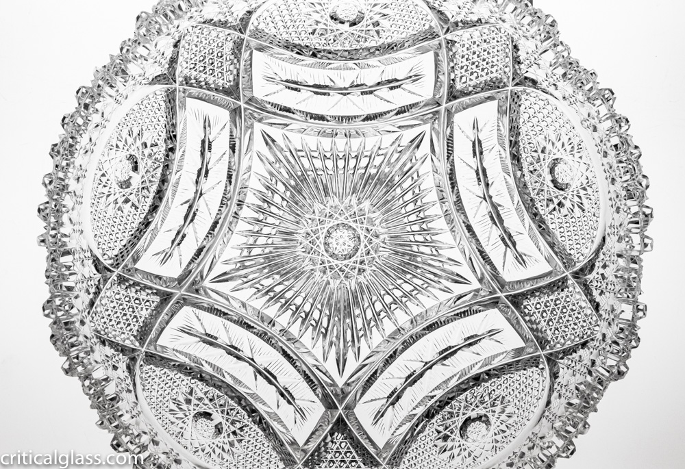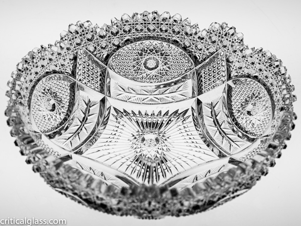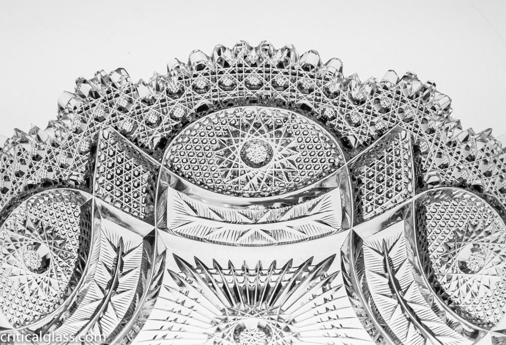 This design is shown in the trade-advertisements for Ohio Cut Glass. It features a wide variety of detailed motifs throughout the bowl – only a very experience cutter must have been able to achieve this execution. The pattern is similar to Libbey’s Diana, but features a ton more detail.