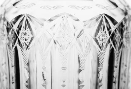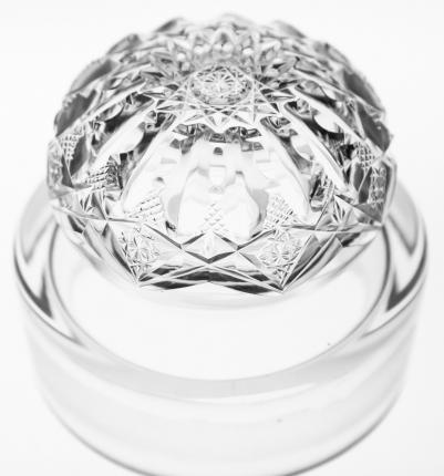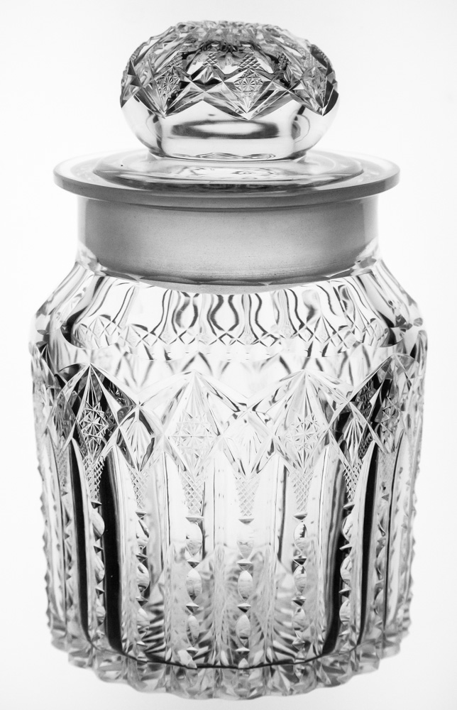 The clarity on this blank is noticeably better than most and deserves to be mentioned first.  A chain of flat hobstars and downward fans goes around the upper portion of the jar. Each of these comes to a point and is met by tiny, fine crosshatching The fine crosshatching sits atop wide notching and frames the upper portion of a deep, wide miter that extends all the way to the base. The base is covered in a 24-point hobstar base and the lid is completely cut in pattern.