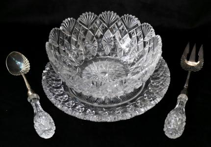 The punch bowl is quite large, measuring over 14 3/4″ wide and over 13″ tall. The ladle is 13 1/2″ long. The blank is wonderfully clear and heavy and sets off this particularly brilliant pattern. It’s in perfect condition. Punch bowls this great seldom come along, but a matching ladle is nearly unheard of – especially with silver.