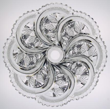 The bowl cosnists primarily of hobstars. So what’s so special about this pattern? Well each of the hobstars is cut with laser-like precision and has 40 points! Not to mention, the center hobstar hsa 48-points! Oh I forgot to mention that each hobstar is finished with a lapidary center and all the rest of the pattern is made up of tightly cut hexad. Simply put, this pattern is unbeatable.